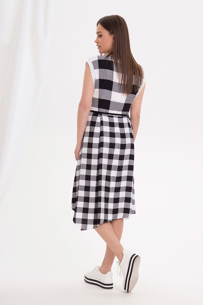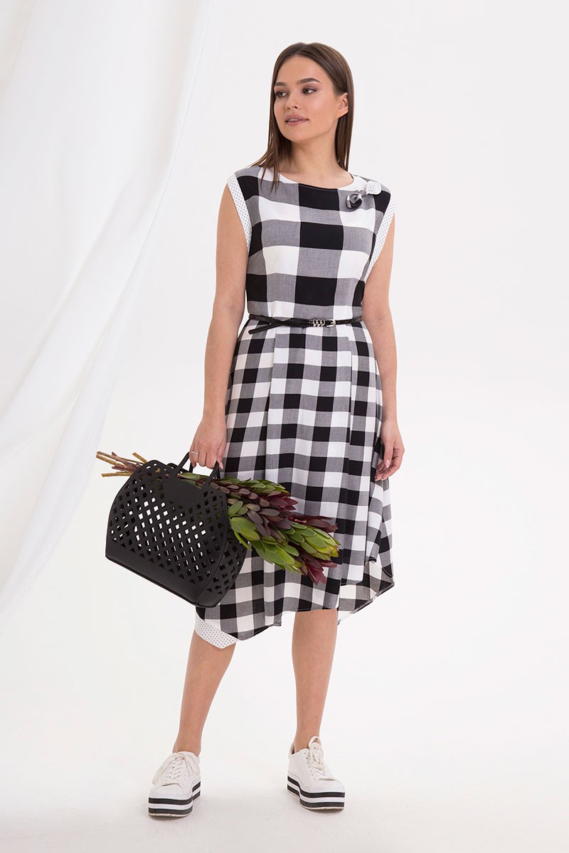 Нежное и оригинальное за счет своего кроя платье полуприлегающего силуэта, с расширенной юбкой, благодаря принту в клетку отлично подойдет как для дневных, так и для вечерних прогулок, мягкое спущенное плечо обеспечит комфортом на весь день. Модель длиной ниже колена, с неровной линией низа. Платье отрезное по линии талии. Лиф платья выполнен из крупной клетки, юбка платья – из мелкой. Лиф спинки с талиевыми вытачками и средним швом, в котором обработана застежка на потайную тесьму-«молнию». Лиф переда с талиевыми и нагрудными вытачками. По линии плеча притачаны вставки из отделочной ткани, которые доходят до линии талии. Юбка платья расширенная, с мягкими складками по талии. Низ юбки ассиметричный, по переду частично притачана планка из отделочной ткани. Горловина округлой формы. По лифу пришит декор в виде бантика. По талии настрочены шлевки и протянут ремень.