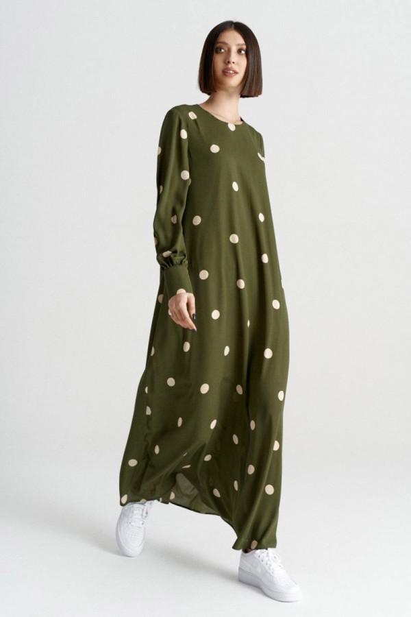Платье женское прямого свободного кроя на подкладке. Горловина овальная. Рукав объёмный со сборкой по окату, по низу рукава широкие манжеты с застежкой на 4 пуговички. Застежка - петля пуговичка по спинке изделия.
